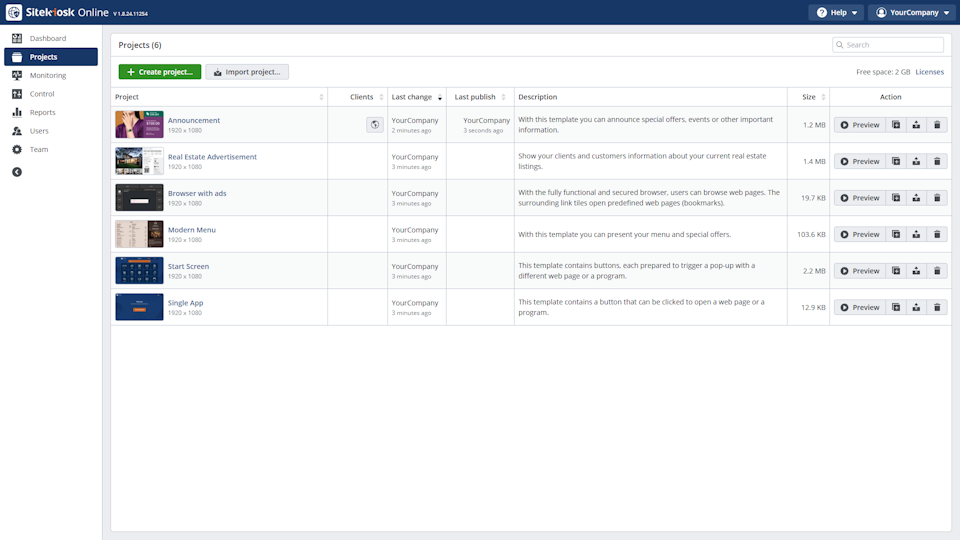 Im Projekte Bereich können Sie neue Projekte erstellen, bestehende Projekte verwalten, bearbeiten und auf Ihren Clients veröffentlichen.
